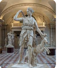 Πρωτότυπος τίτλος: Άρτεμις η Κυνηγέτις. Απεικονίζεται η θεά του κυνηγιού με κοντό χιτώνα και σανδάλια, χλαμύδα δεμένη στη μέση και με διάδημα . Η θεά φαίνεται να κινείται με δύναμη προς τα μπροστά δίπλα σε ένα ελάφι. Με το δεξί χέρι κρατούσε το τόξο, ενώ με το αριστερό ετοιμαζόταν να βγάλει ένα βέλος από τη φαρέτρα που είχε κρεμασμένη στην πλάτη. Το άγαλμα είναι ένα ρωμαϊκό αντίγραφο που βασίστηκε στα αθηναϊκά πρότυπα, τα οποία υπηρέτησε πιστά η γλυπτική τέχνη του Λεωχάρους.